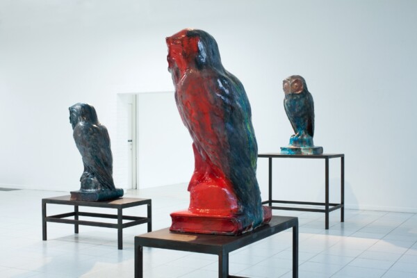 Une exposition de Johan Creten peut être considérée comme une Wunderkammer ou une armoire de curiosités - la collection de l’humaniste - où se combinent beauté, étrangeté et particularité. C’est un microcosme qui incarne la vision subjective de l’artiste sur le monde et son histoire. Les animaux qui peuplent le monde de Creten évoquent différentes significations symboliques et métaphoriques pour le spectateur, comme les abeilles qui représentent la communauté, les hiboux l’intelligence (ou son absence), les aigles le pouvoir et les pieuvres l’inframonde féerique. Ce qui fascine cependant Creten, c’est la manière dont il peut charger ces motifs de nouvelles significations, en utilisant des connotations érotiques, historiques de l’art ou personnelles, et comment il peut simultanément transformer une image particulière en une forme et une matière prenantes.